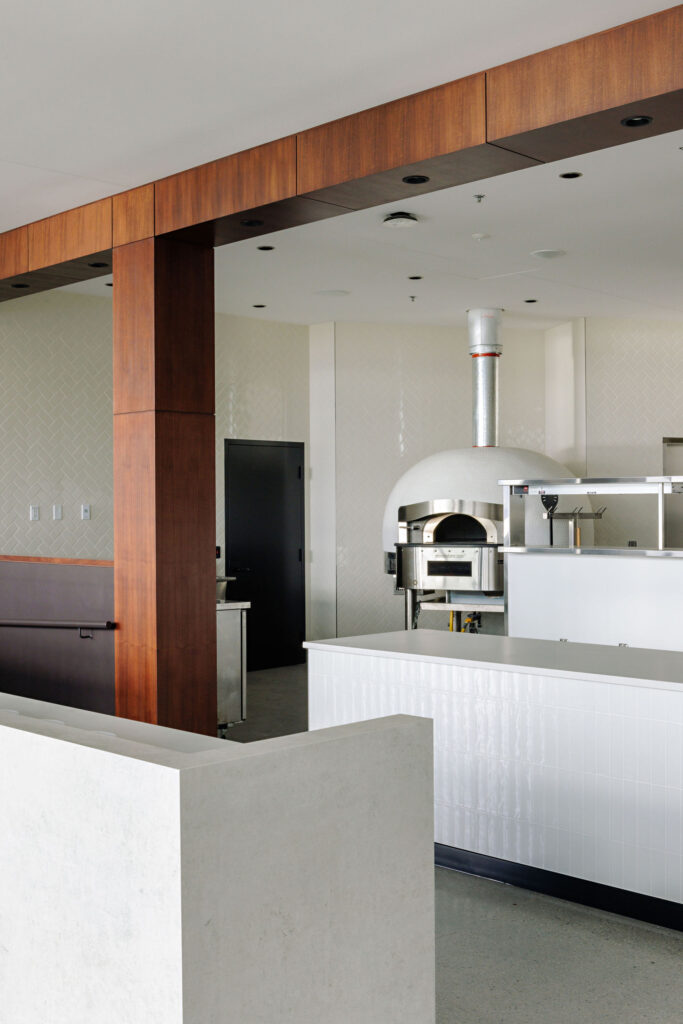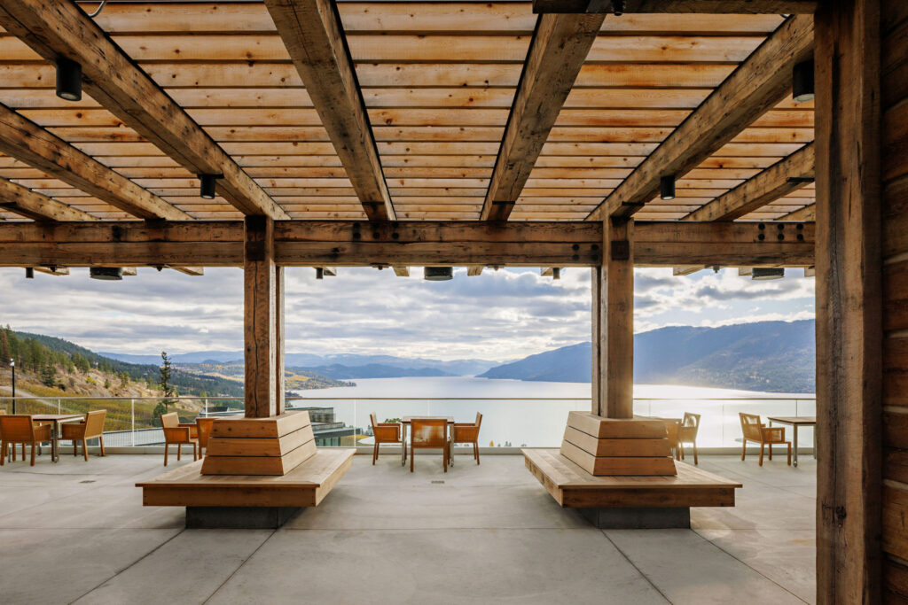 The space is light-filled and airy, with sweeping views across the estate and Okanagan Lake, while the open kitchen and granite-lined interior invite guests to connect with the energy and craft behind each dish. Above, the Packinghouse Pergola Patio, built from reclaimed wood from Kelowna’s historic Laurel Packinghouse, provides an exceptional vantage point, offering panoramic views south down the lake, with the William R. Bennett Bridge visible on clear days.